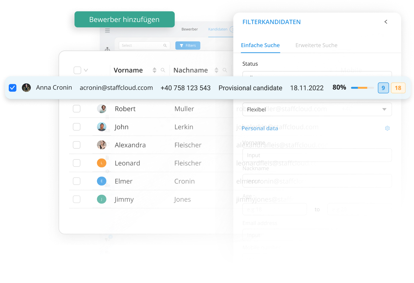 Nach den Interviews sorgt Staffcloud dafür, dass Sie alle wichtigen Daten und Dokumente von den Bewerbern erhalten und Sie nach einer Kontrolle den Bewerber mit einem Klick zum Mitarbeiter befördern.