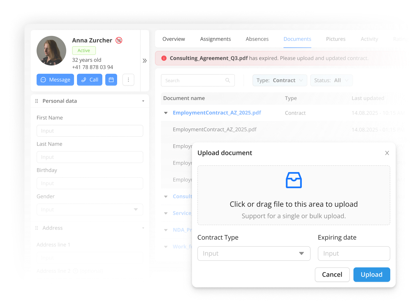 Keep track of which of your employees' documents are still valid. Temporary employment contracts, residence permits, or student certificates. If documents are about to expire, employees can upload the updated documents themselves.
