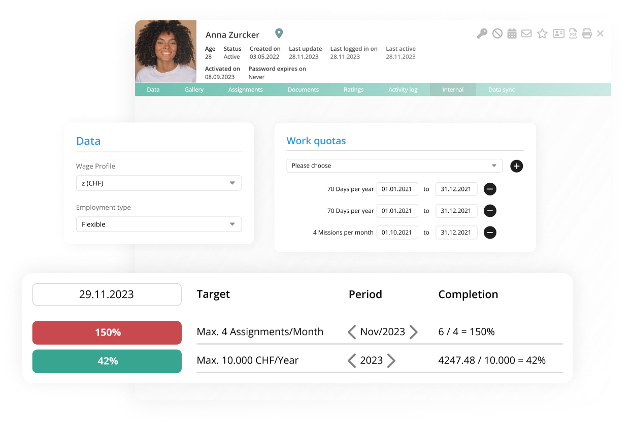 The planned working times module takes all the different employment models into account and enables you and your employees to optimise your planning and keep to the respective time limits. Both planning and employee profile show you the hours already worked and the costs accrued, so you can decide whether you would like to keep planning with an employee or not.