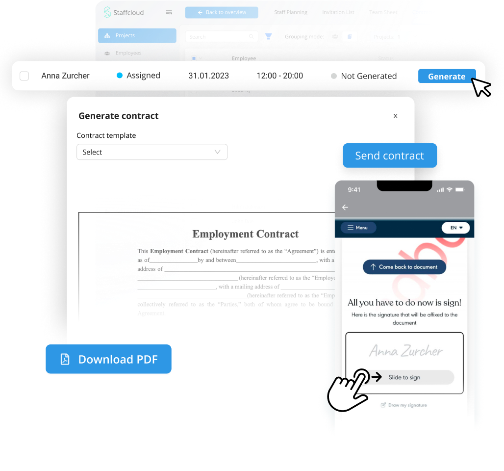 Maak, verstuur en beheer alle contracten met je medewerkers rechtstreeks in Staffcloud. Of het nu gaat om een raam- of opdrachtovereenkomst, of gewoon een bevestiging die een digitale handtekening vereist, alles is met een paar klikken geregeld en wordt automatisch opgeslagen in het personeelsdossier van de medewerker.